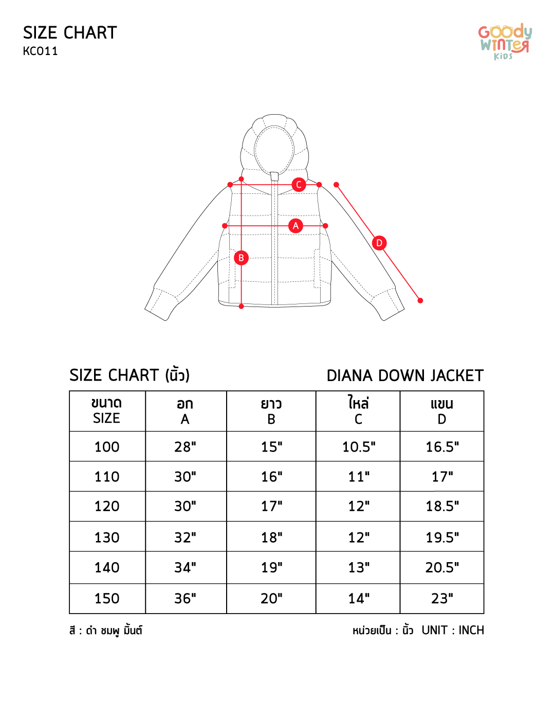 110 : อก 30" ยาว 16" ไหล่ 11" เเขน 17"